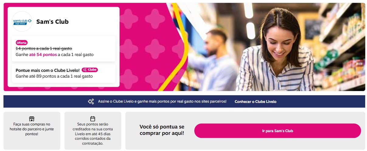 Excelente oportunidade para você que já estava pensando em assinar o Sam’s Club. O programa é o maior clube de compras do Brasil e possui mais de 54 lojas em todos o território nacional. Com a parceria, além de aproveitar todos os benefícios do clube, ainda é possível acumular até 89 pontos por real na Livelo com a assinatura.