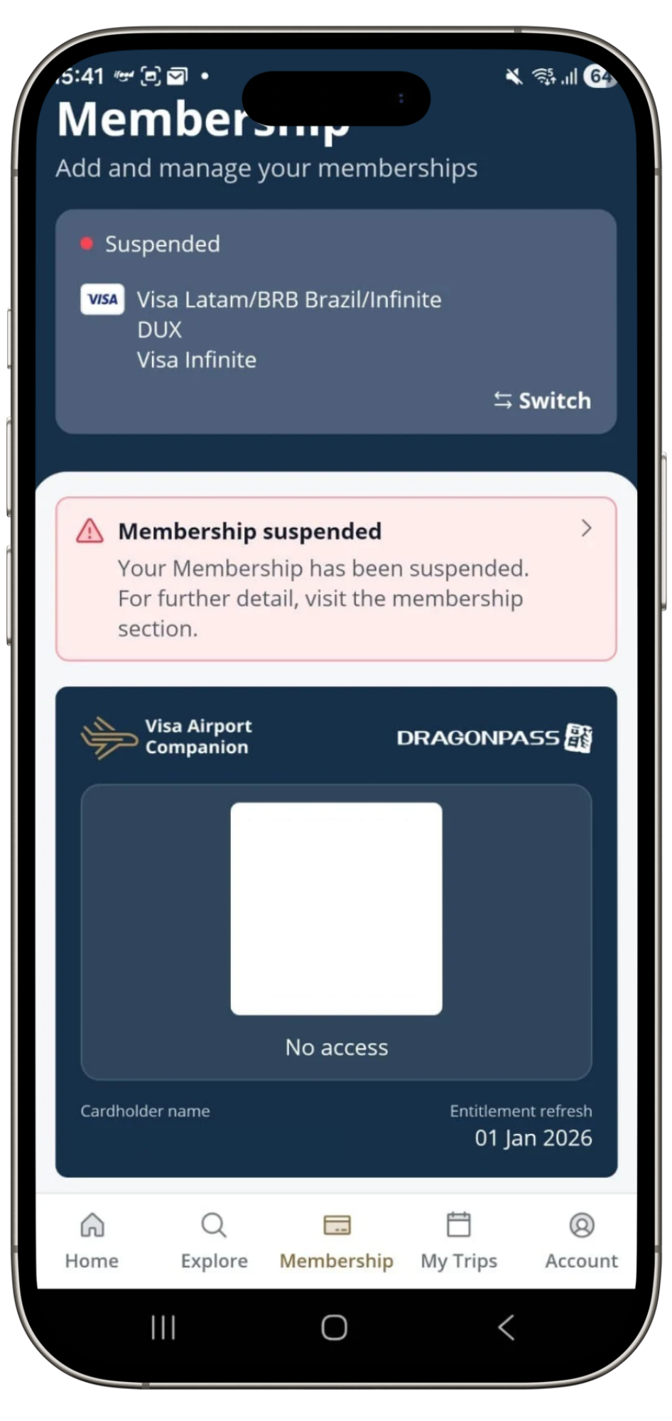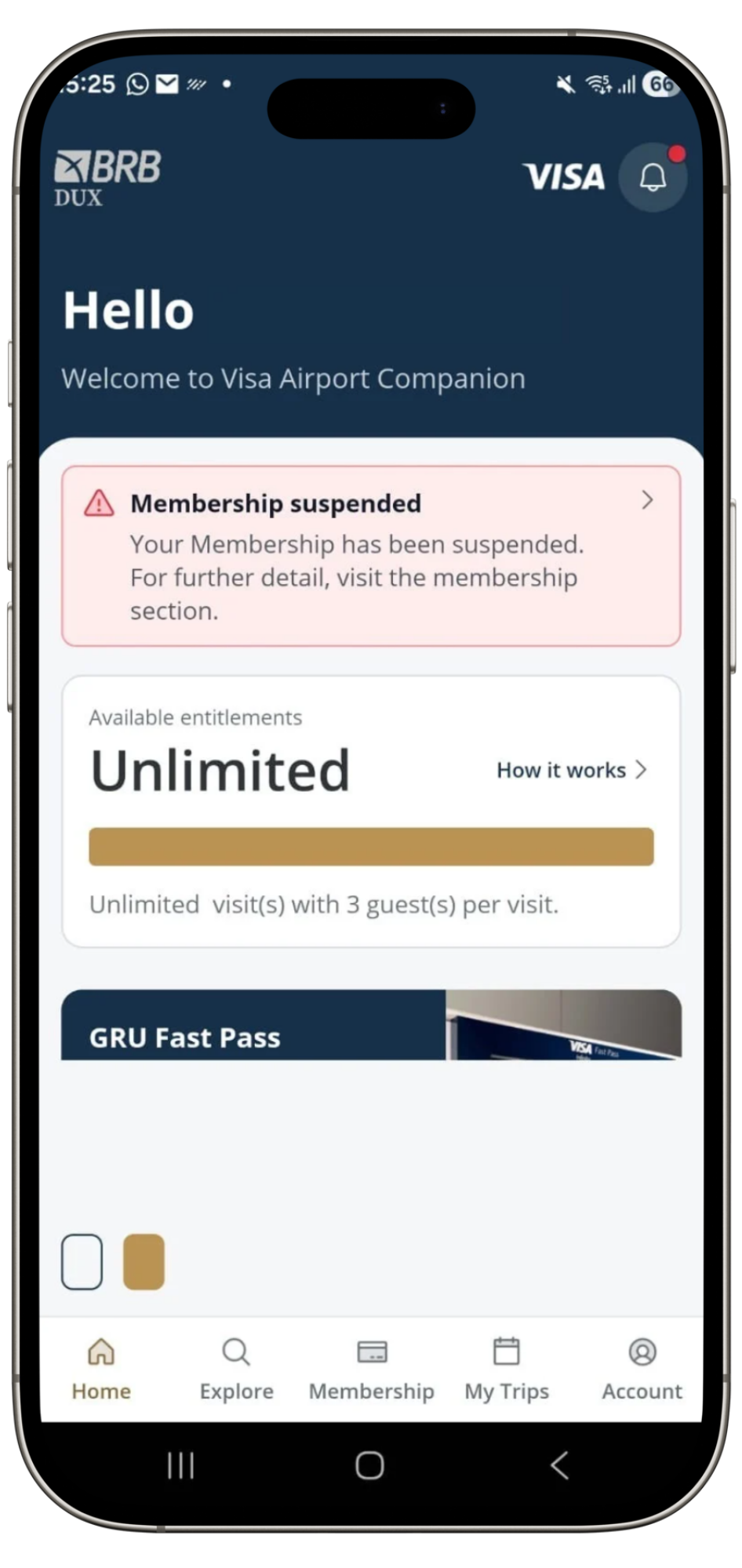 Ao acessar o aplicativo, consta a mensagem informando a suspensão do programa Visa Airport Companion. O exemplo abaixo é de um cartão BRB DUX Visa. A imagem com o aviso pode ser vista abaixo. Ao tenta gerar o QR Code da associação, este também consta como cancelado. Confira abaixo: