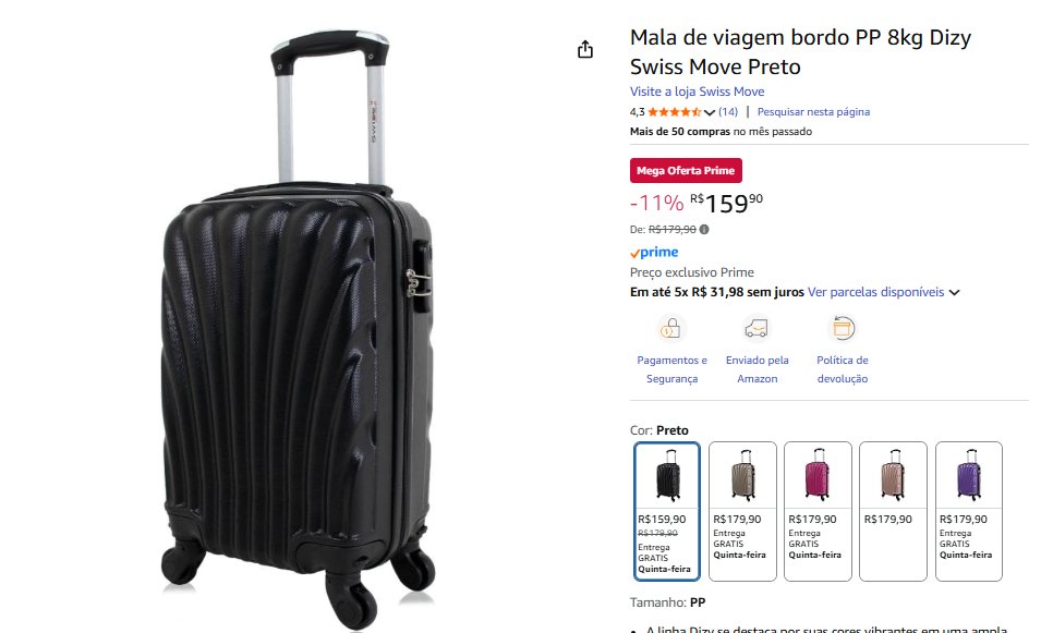 - Mala de Viagem Swiss Move | 11% de desconto total R$ 159,90 – compre aqui