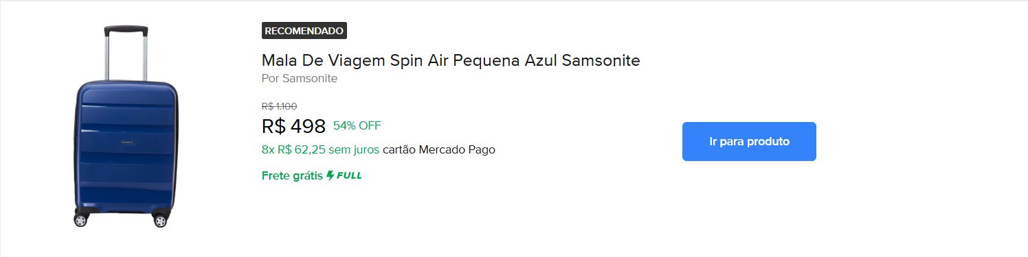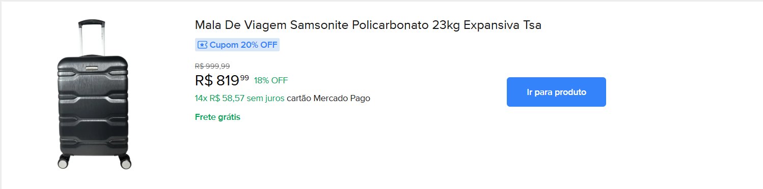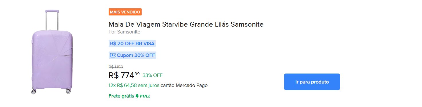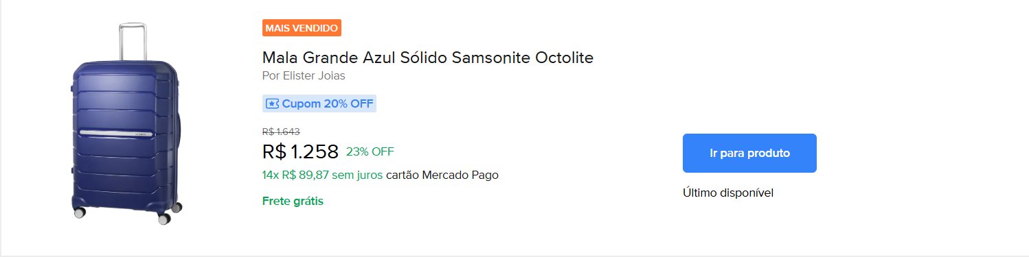 Procurando malas para a sua próxima viagem? O Mercado Livre está com uma seleção de malas Samsonite com até 54% de desconto! Os descontos são ofertas relâmpagos, então acelere para comprar a sua porque os produtos podem se esgotar a qualquer momento. Confira!