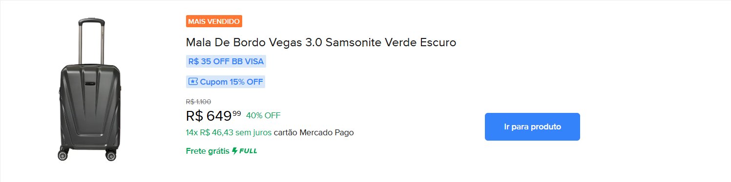 Procurando malas para a sua próxima viagem? O Mercado Livre está com uma seleção de malas Samsonite com até 54% de desconto! Os descontos são ofertas relâmpagos, então acelere para comprar a sua porque os produtos podem se esgotar a qualquer momento. Confira!