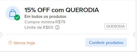 - 15% off, chegando até R$ 60 de desconto, em compras a partir de R$ 79, com o cupom ‘QUERODIA’ [sem aspas];