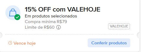 - 15% off, chegando até R$ 60 de desconto, em compras a partir de R$ 79, com o cupom ‘VALEHOJE’ [sem aspas];