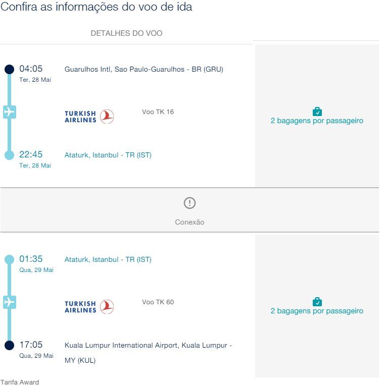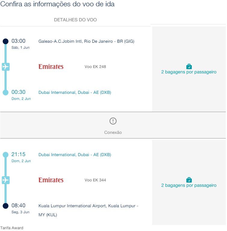 Veja abaixo um exemplo entre São Paulo (GRU) e Kuala Lumpur (KUL) em voo inicial com Lufthansa, realizando conexão em Frankfurt, seguindo com a Singapore para mais uma conexão em Singapura, para então continuar até Kuala Lumpur com a mesma companhia: