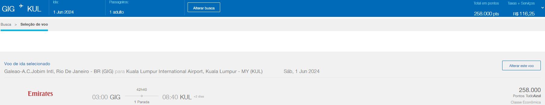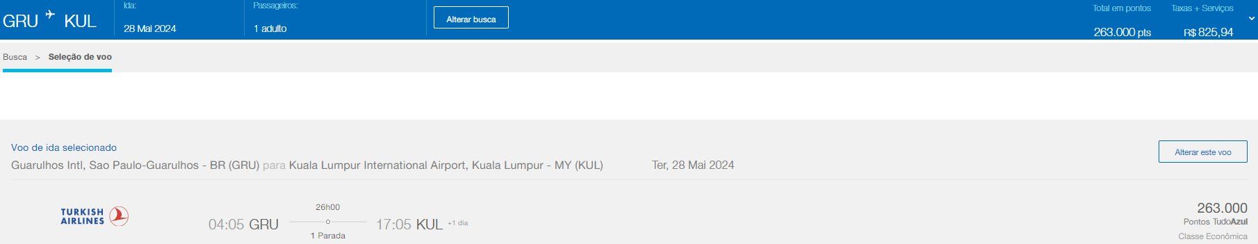 No Azul Fidelidade, existe a possibilidade de emitir voos com pontos em companhias parceiras através do Interline Azul, agora chamado de “Azul pelo Mundo em pontos”. Para a Malásia, é possível emitir voos com a Emirates e Turkish, uma vez que são as únicas parceiras do programa que realiza a rota e oferece tarifas award. Veja abaixo exemplos de emissão entre São Paulo (GRU) e Kuala Lumpur (KUL) em Classe Econômica com a Turkish e também com a Emirates: