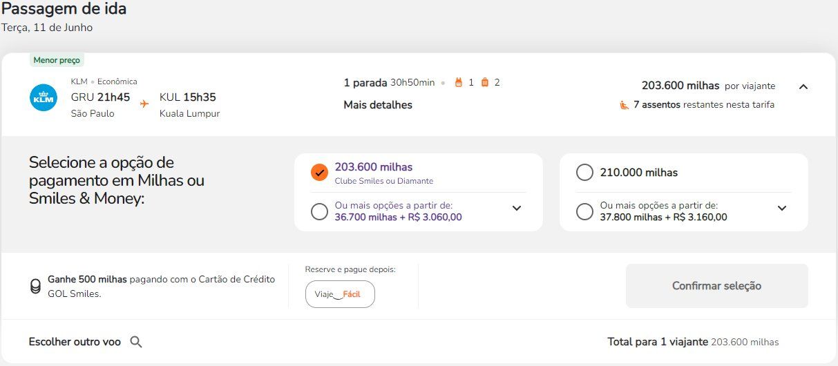 Para voar com a KLM, podemos encontrar voos com conexão em Amsterdã saindo do Rio de Janeiro (GIG) ou São Paulo (GRU). Veja abaixo um exemplo em Classe Econômica com a KLM, saindo de São Paulo (GRU) com destino a Kuala Lumpur (KUL) na Malásia, pelo custo de 203.600 milhas o trecho para assinantes do Clube Smiles ou clientes Diamante. O preço em taxas para esta emissão com origem no Aeroporto de Guarulhos é de R$ 207,73.