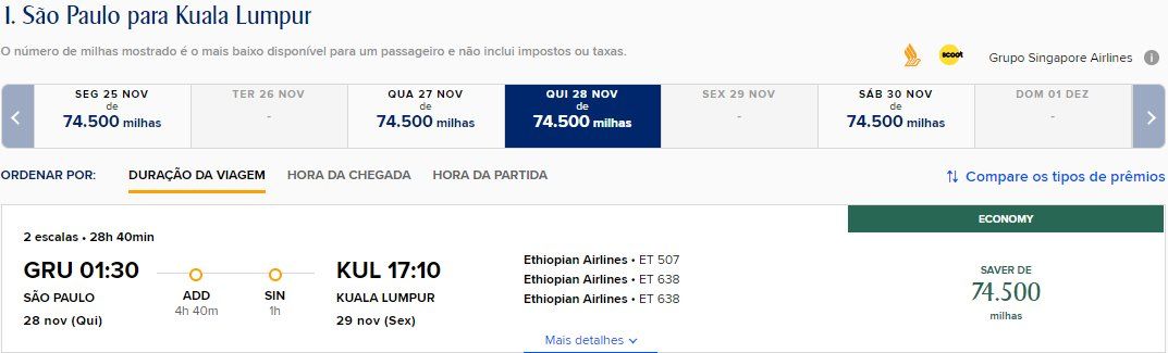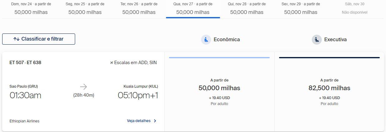 Veja abaixo um exemplo entre São Paulo (GRU) e Kuala Lumpur (KUL), voando com a Ethiopian em Classe Econômica e Executiva: