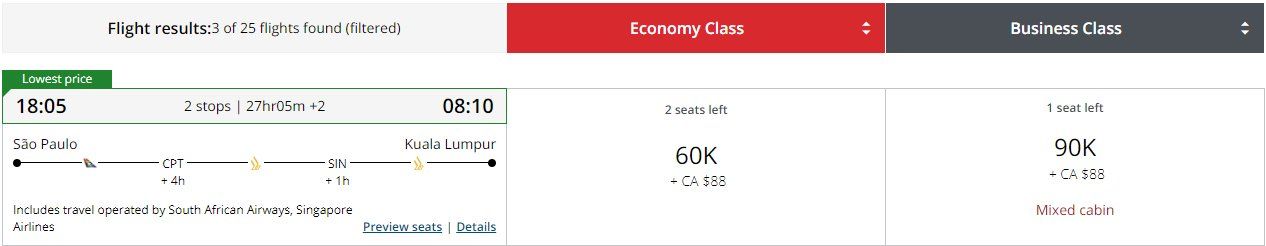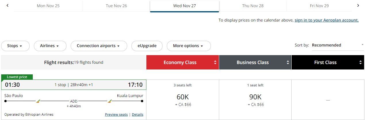 O Aeroplan da Air Canada precifica o trecho em 60.000 milhas em Classe Econômica e 90.000 milhas em Classe Executiva para voos com as companhias parceiras da Star Alliance como a Ethiopian e Singapore, por exemplo. Cabe ressaltar que o programa não cobra a desagradável taxa de combustível (YQ). Veja abaixo um exemplo entre São Paulo (GRU) e Kuala Lumpur (KUL) em voo com conexão em Adis Abeba com a Ethiopian em Classe Econômica e Executiva: