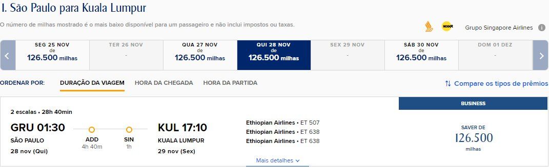 Já o Krisflyer, programa da Singapore Airlines, cobra 74.500 milhas em Classe Econômica nos voos partindo do Brasil para a Malásia em companhias parceiras da Star Alliance. Já para a Classe Executiva, o valor cobrado é de 126.500 milhas. A má notícia fica por conta do programa repassar taxas de combustível de voos que partem de fora do Brasil. Veja o exemplo a seguir para o voo entre São Paulo (GRU) e Kuala Lumpur (KUL) com a Ethiopian em Classe Econômica e Executiva: