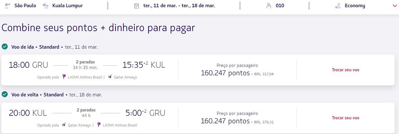 No exemplo abaixo, encontramos o trecho de ida entre São Paulo (GRU) e Kuala Lumpur (KUL) com conexões em Barcelona e Doha em Classe Econômica por 160.247 pontos + R$317,94 com a LATAM em conjunto com a Qatar e o de volta com conexões em Doha (DOH) e Madrid (MAD) por 160.247 + R$ 379,31 com a Qatar em conjunto com a LATAM. Os preços, neste caso, serão sempre menores em viagens de ida e volta.
