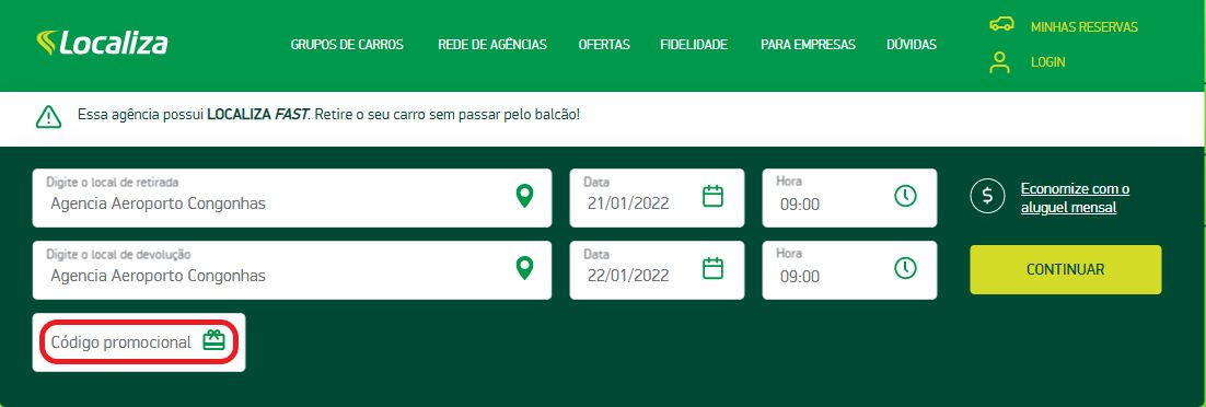 Assim que você resgata o voucher no Mastercard Surpreenda, é hora de utilizá-lo no site da Localiza para reservar seu veículo com desconto. O código informado deverá ser adicionado no campo “Código promocional”, logo na primeira página da Localiza: