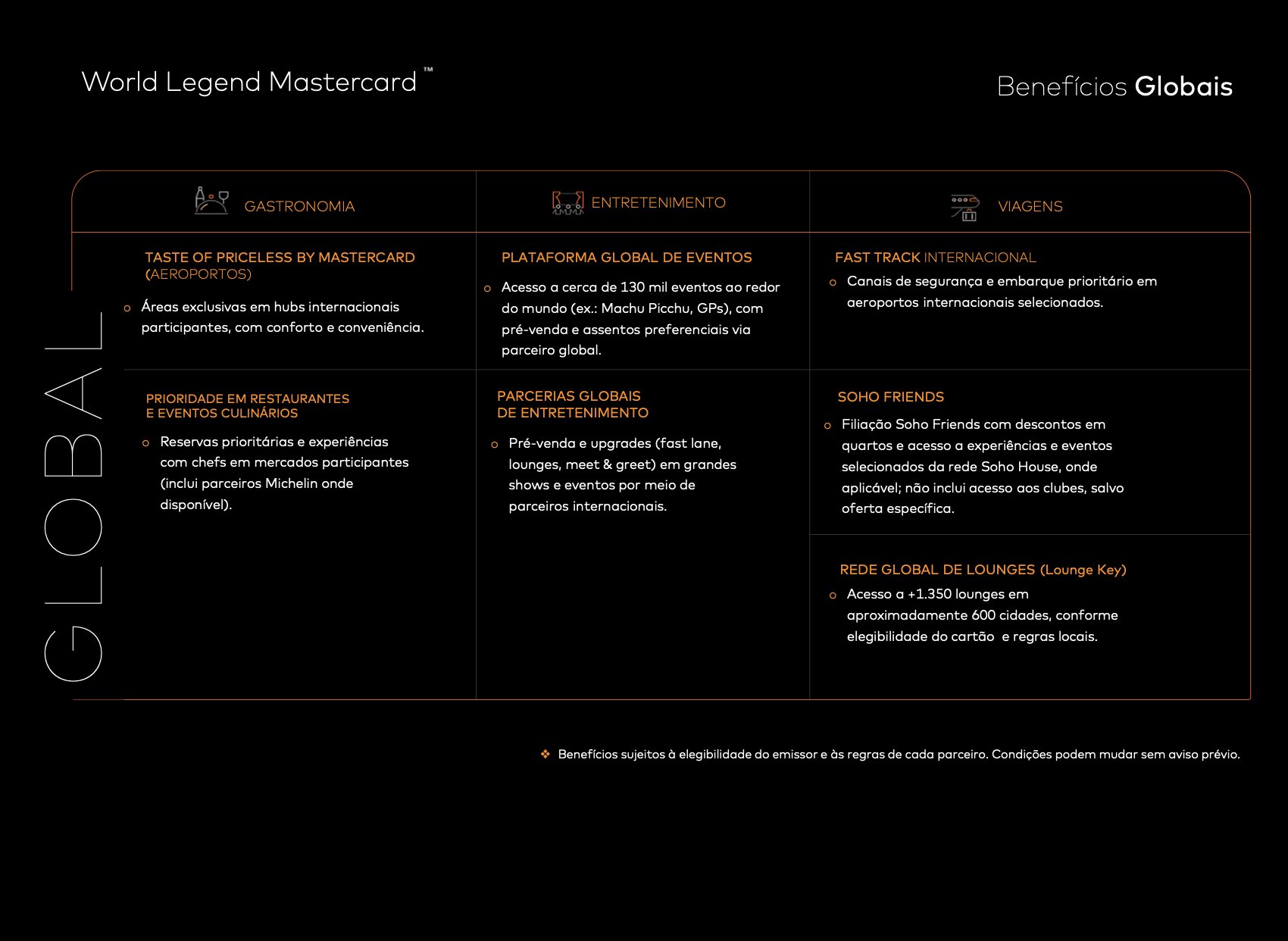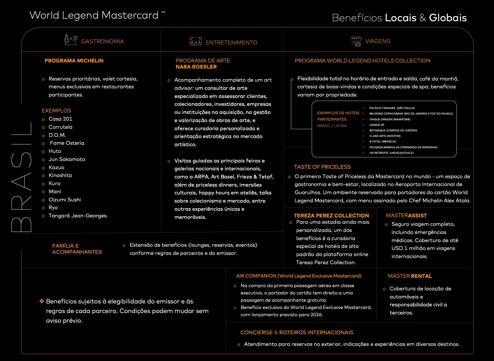 No Brasil, a curadoria de benefícios e experiências do World Legend Mastercard foi especialmente desenvolvida para o segmento de altíssima renda e está estruturada em três pilares principais: gastronomia, entretenimento e viagens. Os benefícios vão além do portador do cartão, contemplando também familiares e amigos, reforçando a proposta de proporcionar momentos compartilhados e experiências exclusivas. Confira abaixo: