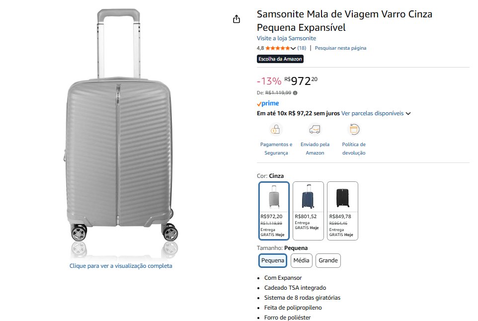 - Samsonite Mala de Viagem Cinza Pequena | 13% de desconto – total R$ 972,20 – compre aqui