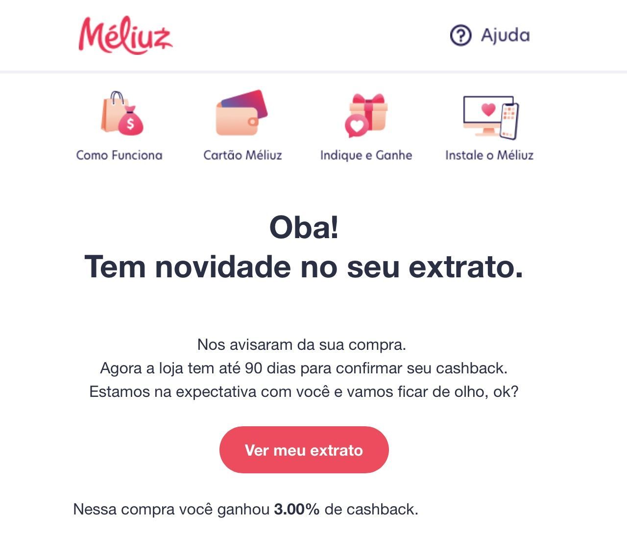 Assim que o Méliuz é avisado, você receberá um e-mail com o Aviso de Compra: