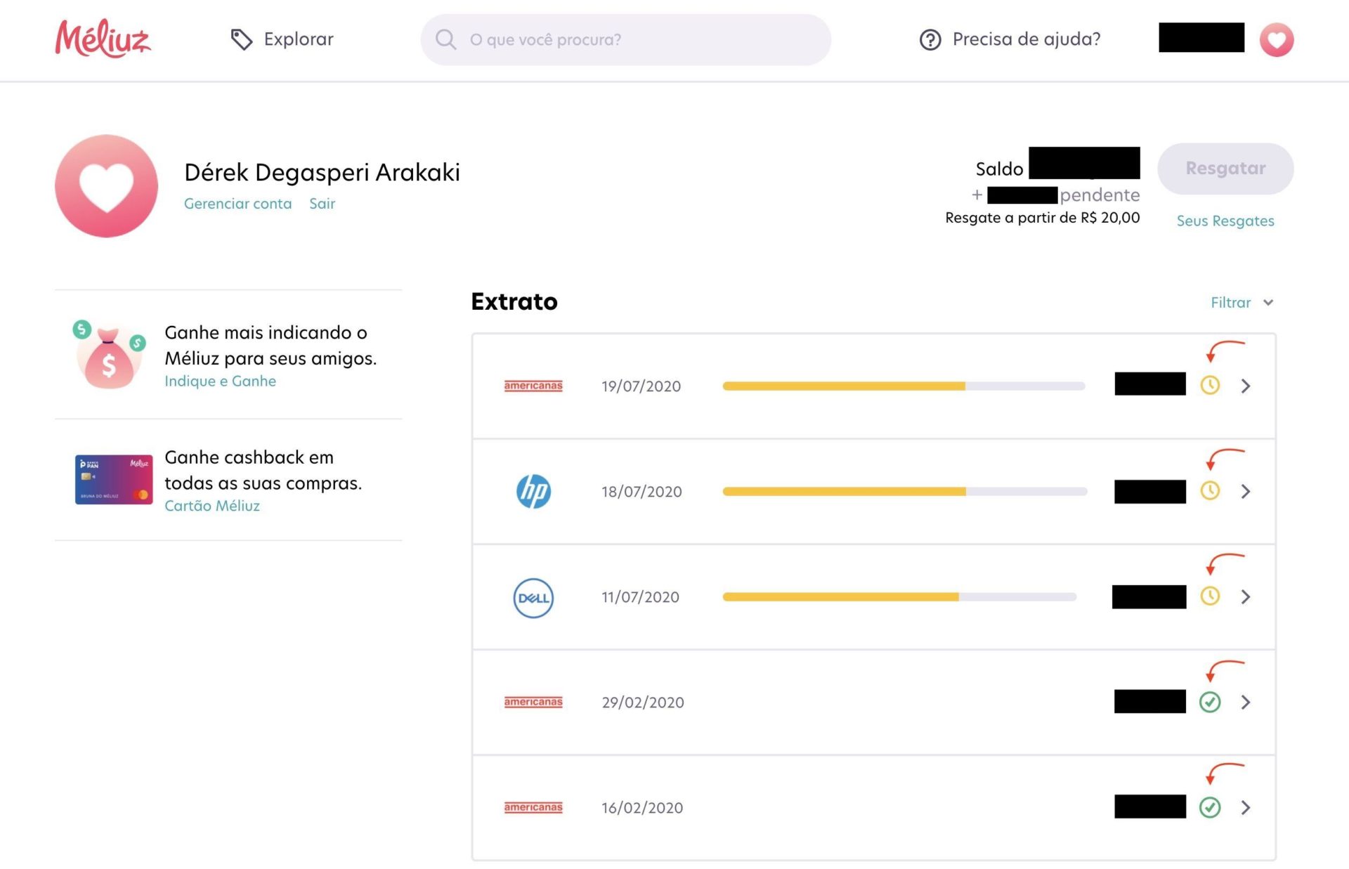 Veja abaixo como funciona o processo para receber o cashback da compra efetuada. Resgatei uma compra que fiz na própria Americanas no passado.