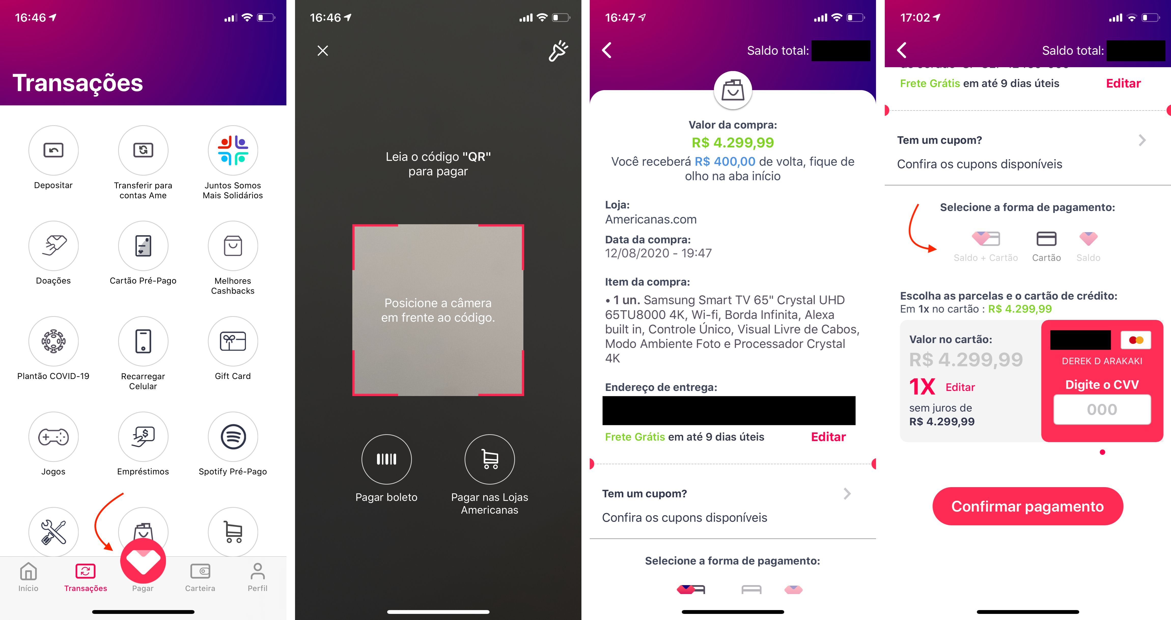 3- Abra o app da Ame, clique em “Pagar” e aponte a câmera para o QR Code.