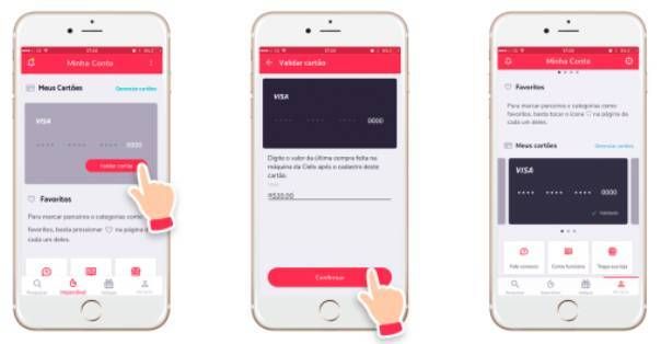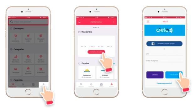 Em seguida vá em “Minha Conta” e cadastre todos os seus cartões. São aceitos cartões de crédito e débito de mais de 27 bandeiras, além de vale alimentação e refeição.