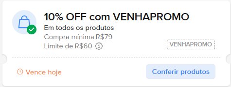 - 10% off, chegando até R$ 60 de desconto, em compras a partir de R$ 79, com o cupom ‘VENHAPROMO’ [sem aspas]