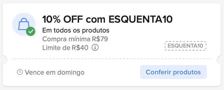 • 10% off, chegando até R$ 40 de desconto, em compras a partir de R$ 79, com o cupom ‘ESQUENTA10’ [sem aspas];