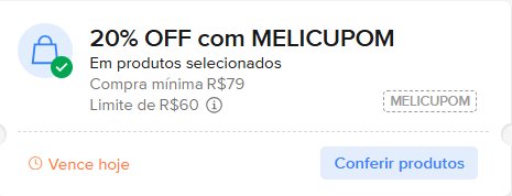 20% off, chegando até R$ 60 de desconto, em compras a partir de R$ 79, com o cupom ‘MELICUPOM‘ [sem aspas];