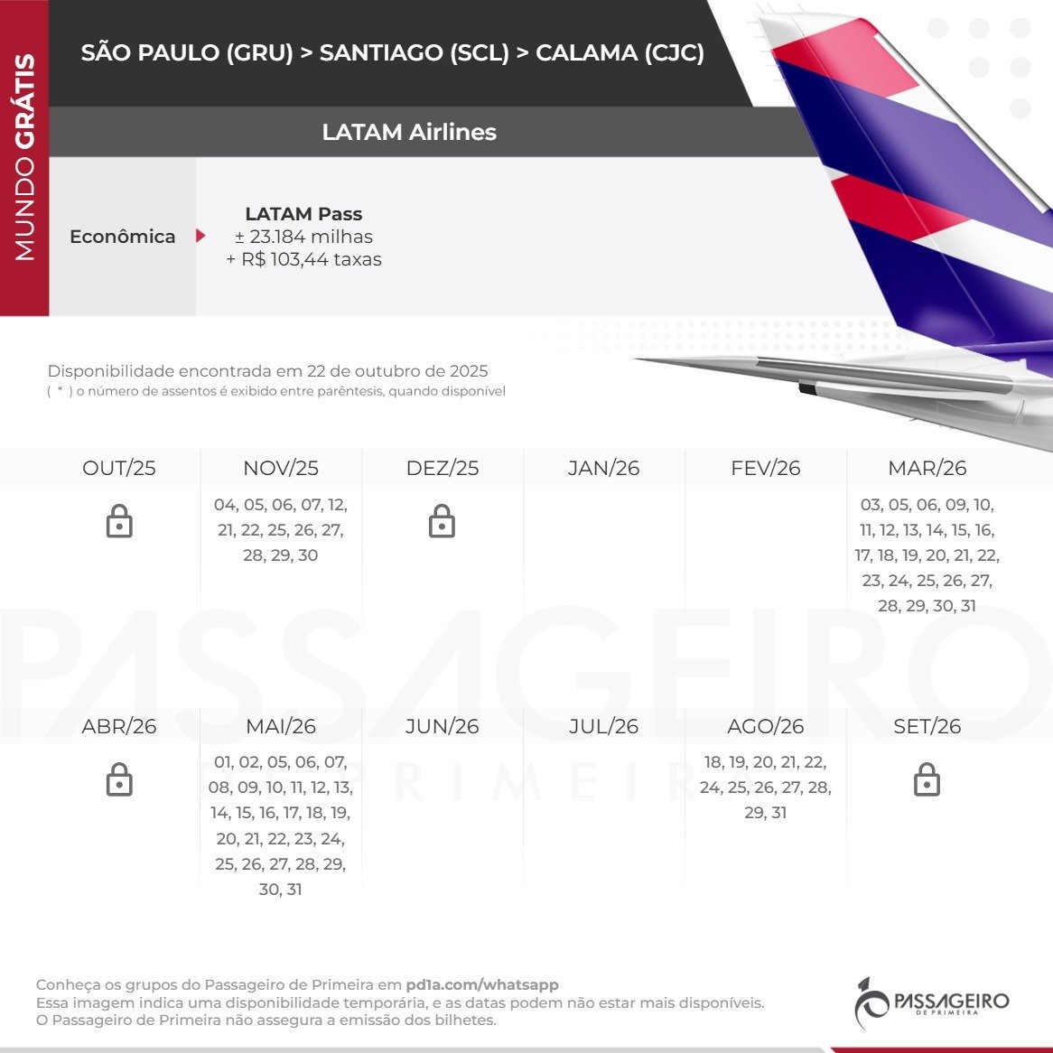 Alerta direto dos Grupos do PP no WhatsApp! 🚨 Em nossas pesquisas, encontramos disponibilidade de bilhetes de ida e volta entre São Paulo (GRU) e Calama (CJC), aeroporto para quem deseja conhecer o Deserto do Atacama. Os voos são operados pela LATAM Airlines e a emissão do trecho pode ser feita a partir de 23.184 milhas LATAM Pass + taxas.
