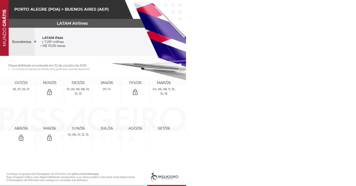 Alerta direto dos Grupos do PP no WhatsApp! 🚨 Encontramos disponibilidade de bilhetes de ida e volta entre Porto Alegre (POA) e Buenos Aires (AEP), na Argentina. Os voos são operados pela LATAM a partir de 7.291 milhas LATAM Pass + taxas o trecho. Confira!