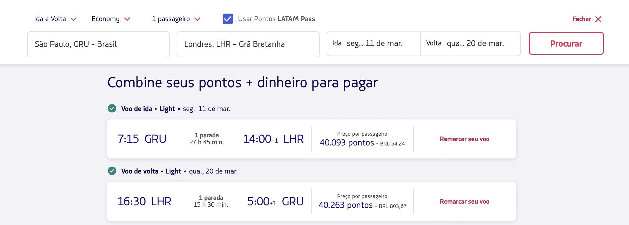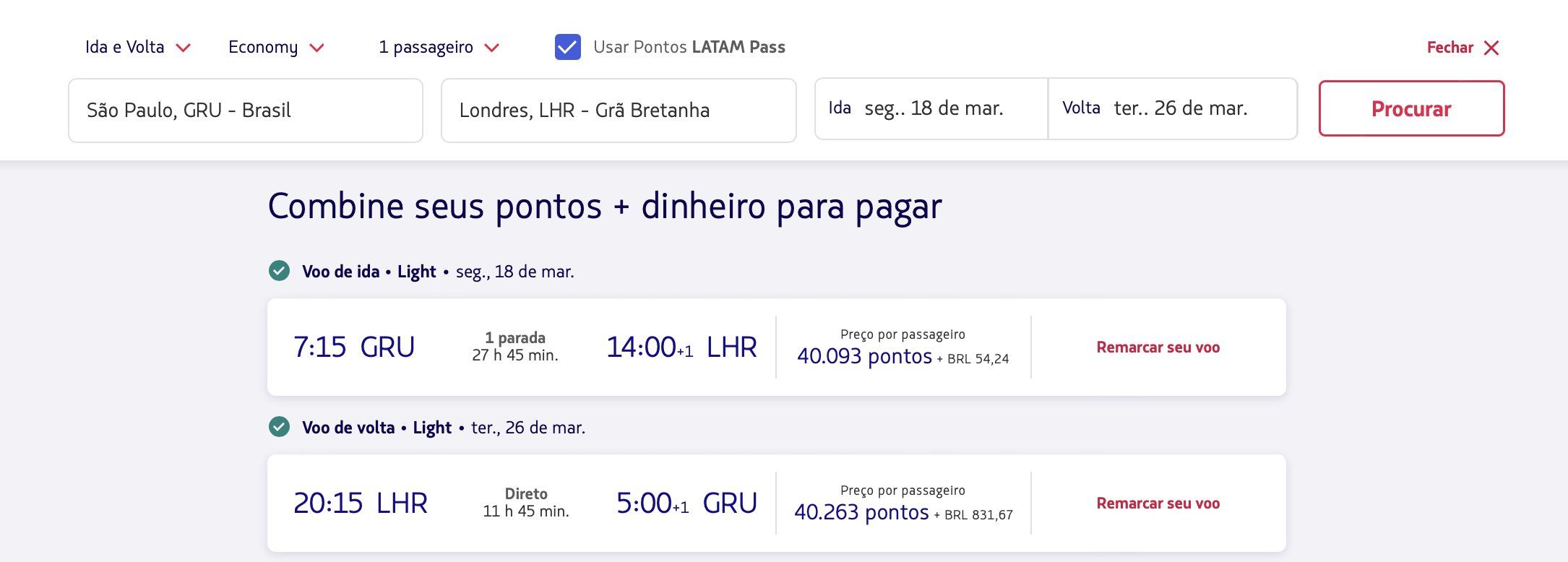 Muito barato! Encontramos disponibilidade de passagens em Classe Econômica no LATAM Pass para Londres (LHR), saindo de São Paulo, por 40.063 pontos + taxas o trecho. Na oferta, os menores valores foram encontrados em voos de ida e volta. Além disso, o programa está oferecendo até 66% de desconto na compra de pontos, o que pode ajudar na hora de emitir o bilhete.