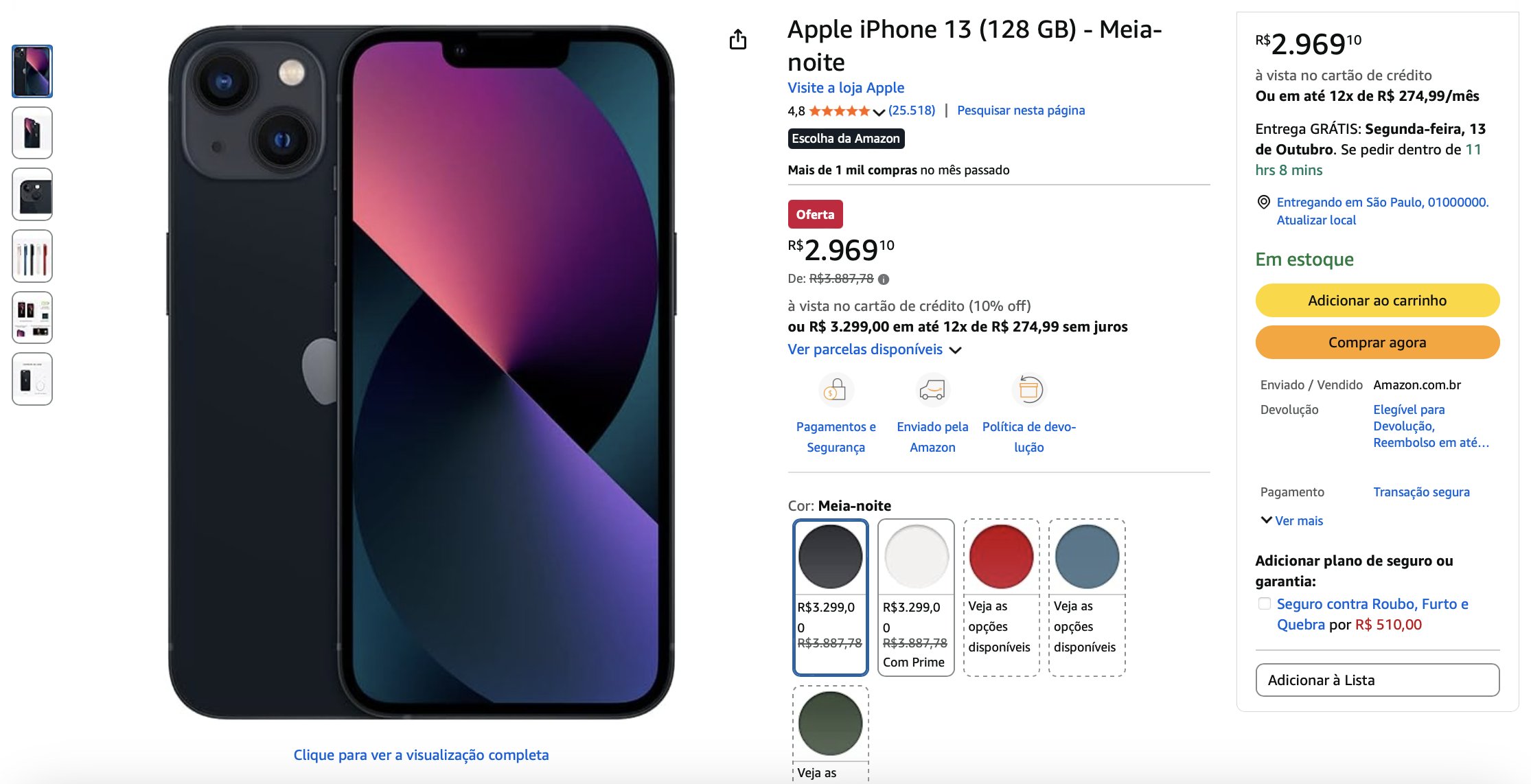 Mega Oferta Amazon Prime! Para você que estava esperando uma oportunidade para comprar um smartphone, encontramos o iPhone 13 128GB Meia-noite no site da varejista por apenas R$ 2.969,10.