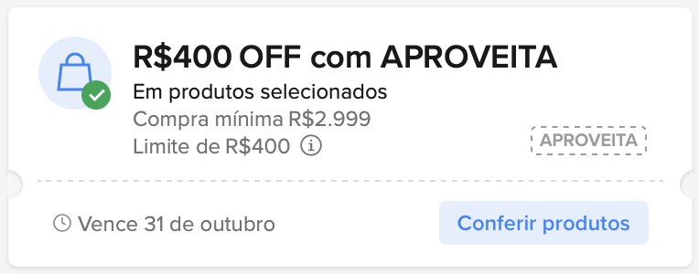 - R$ 400 OFF, para produtos selecionados, em compras a partir de R$ 2.999, com o cupom ‘APROVEITA’ [sem aspas];