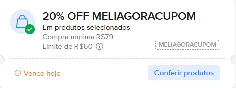 - 20% off, chegando até R$ 60 de desconto, em compras a partir de R$ 79, com o cupom ‘MELIAGORACUPOM‘ [sem aspas];