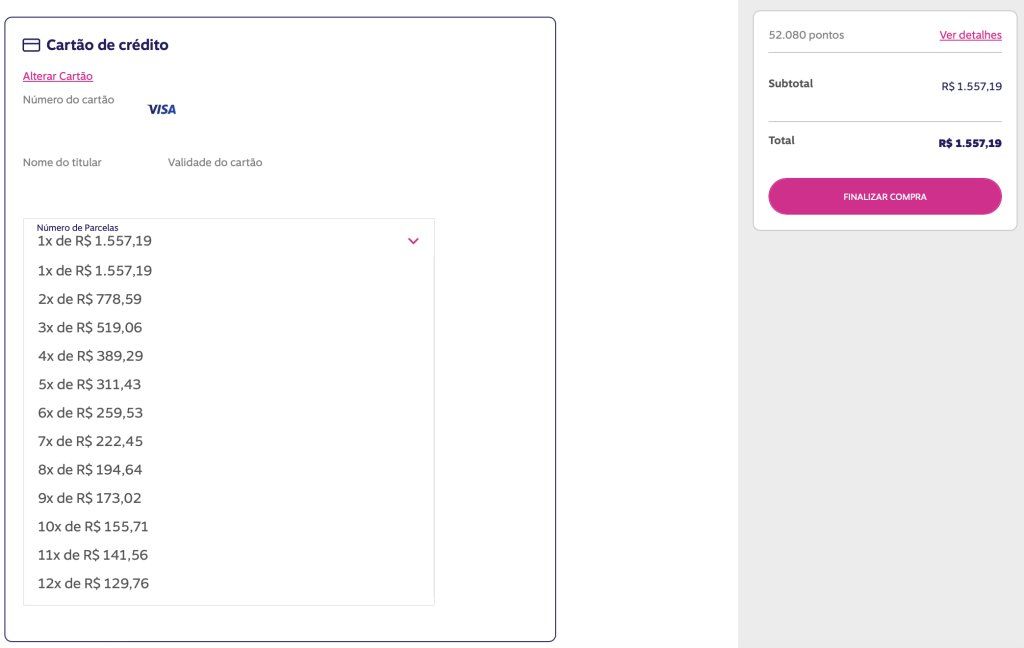 O pagamento desses pontos pode ser feito através do cartão de crédito, com parcelamento em até 12 vezes sem juros ou Pix.