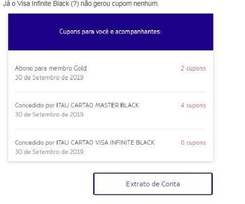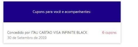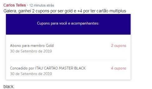 Veja o caso do leitor Carlos, que recebeu 4 cupons através de seu cartão Mastercard Black, além de 2 por ser da categoria GOLD: