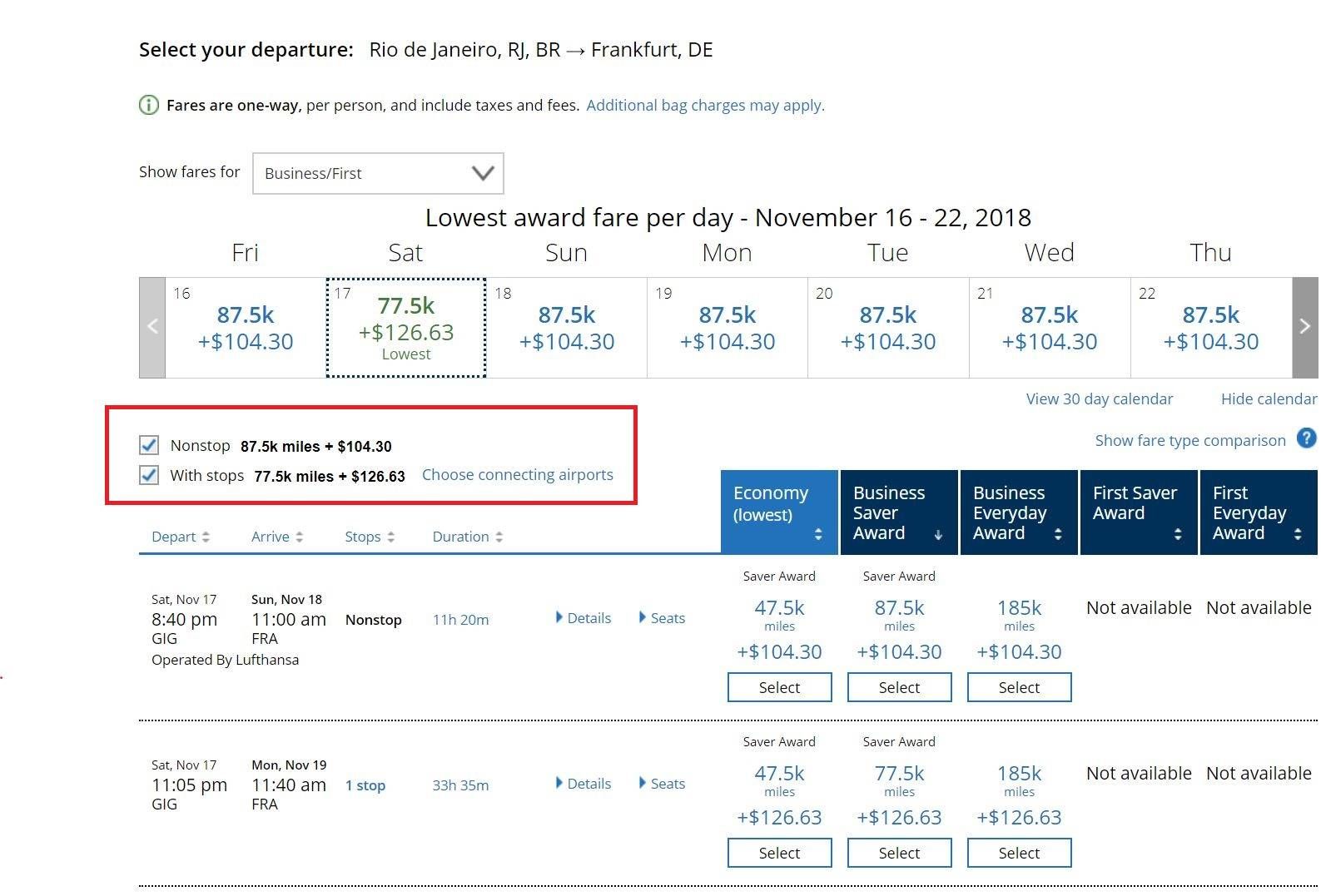 Na simulação acima, fizemos a busca entre Rio de Janeiro e Frankfurt. Agora, alem de permitir a seleção de voos somente sem escalas (com a quantidade de pontos necessários + taxas) o sistema permite a escolha do aeroporto de conexão.