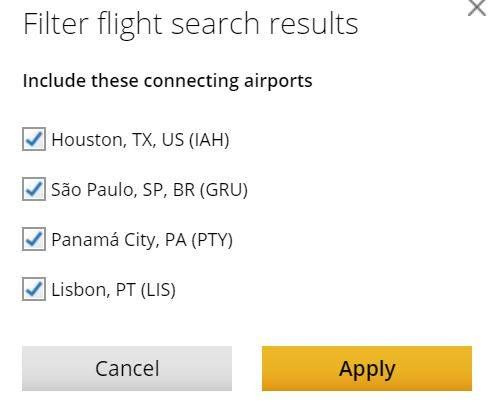 Essa funcionalidade é muito útil. Se a conexão oferecida for pela Cidade do Panamá, muito provavelmente envolverá um voo da COPA, em Lisboa da TAP, etc.