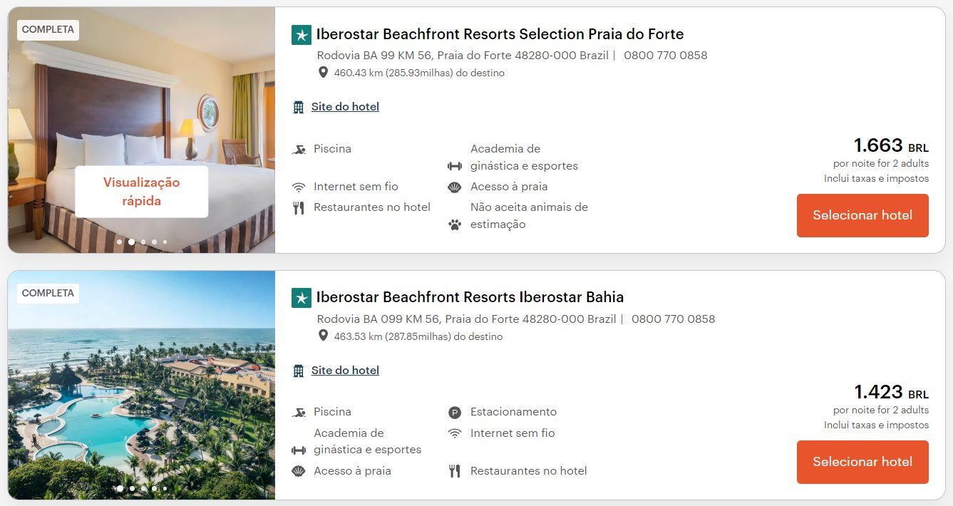 Encontramos diárias no Iberostar Bahia e o Iberostar Selection Praia Do Forte a partir de 84.000 pontos para abril de 2024, para duas pessoas com o sistema all-inclusive. Veja as imagens a seguir o custo em pontos e em dinheiro para as mesmas datas.
