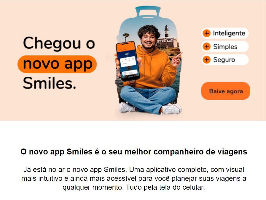 A notícia do novo aplicativo da Smiles já está sendo comunicada aos seus clientes, por e-mail. Confira abaixo o comunicado do programa de fidelidade aos usuários: