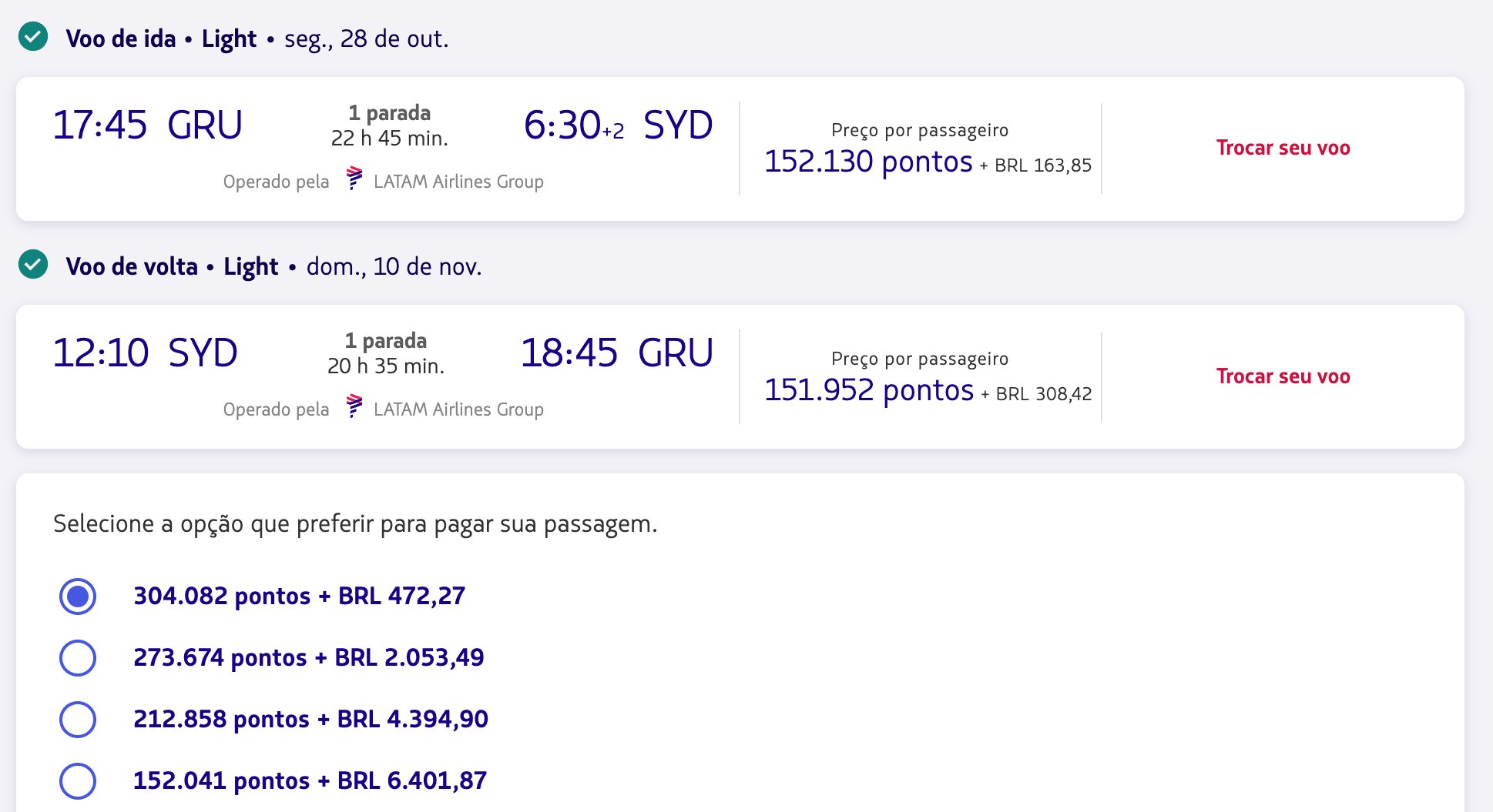 São Paulo (GRU) x Sydney (SYD) – a partir de R$ 151.952 pontos + taxas, o trecho: