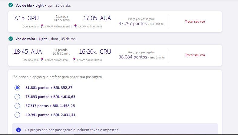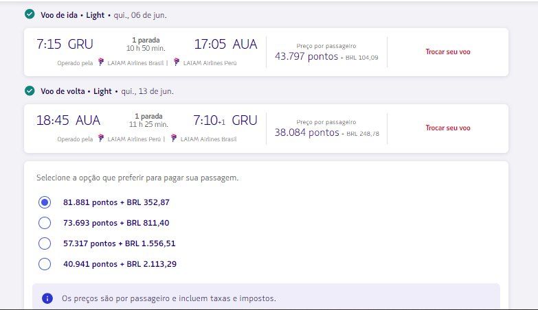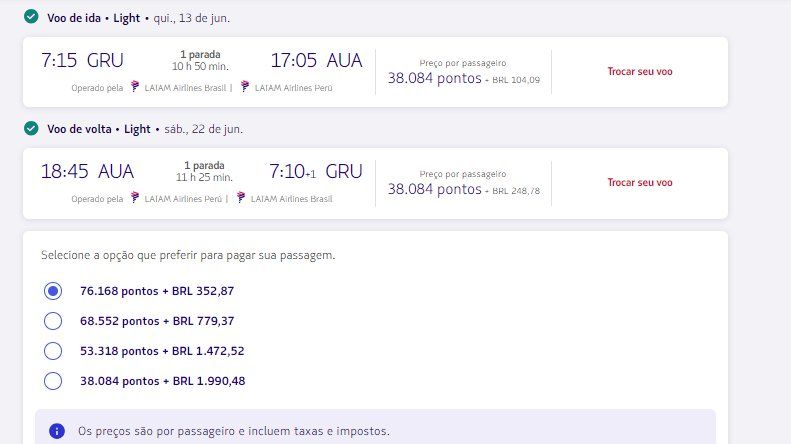 Se você está planejando viajar para Aruba, essa é uma ótima oportunidade para emitir sua passagem a partir de 38.084 pontos + taxas por trecho. Vale ressaltar que você pode encontrar resgates como estes em outras datas do ano ou com saídas de outros lugares.