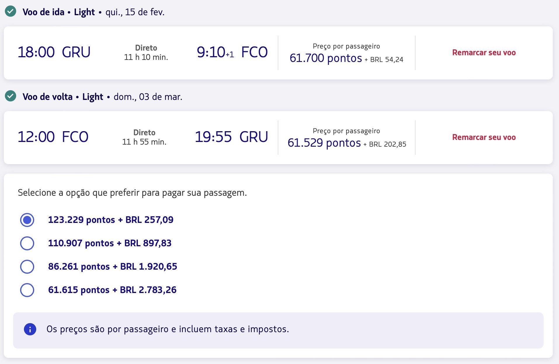Veja a seguir os exemplos de emissão em diferentes datas com destino a Milão ou Roma: