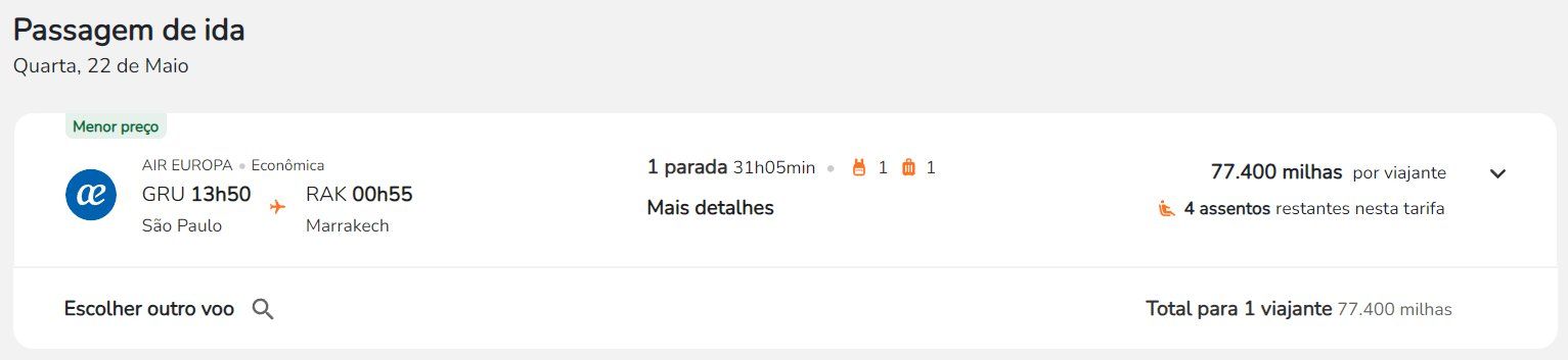 Alerta de oportunidade! 🚨 A Smiles está com uma boa oportunidade de resgate de trechos de voos para Marrakech! Em nossas pesquisas encontramos disponibilidade award para voar na Classe Econômica da Air Europa, em diversas datas, saindo da cidade de São Paulo. Confira quais são as datas disponíveis!