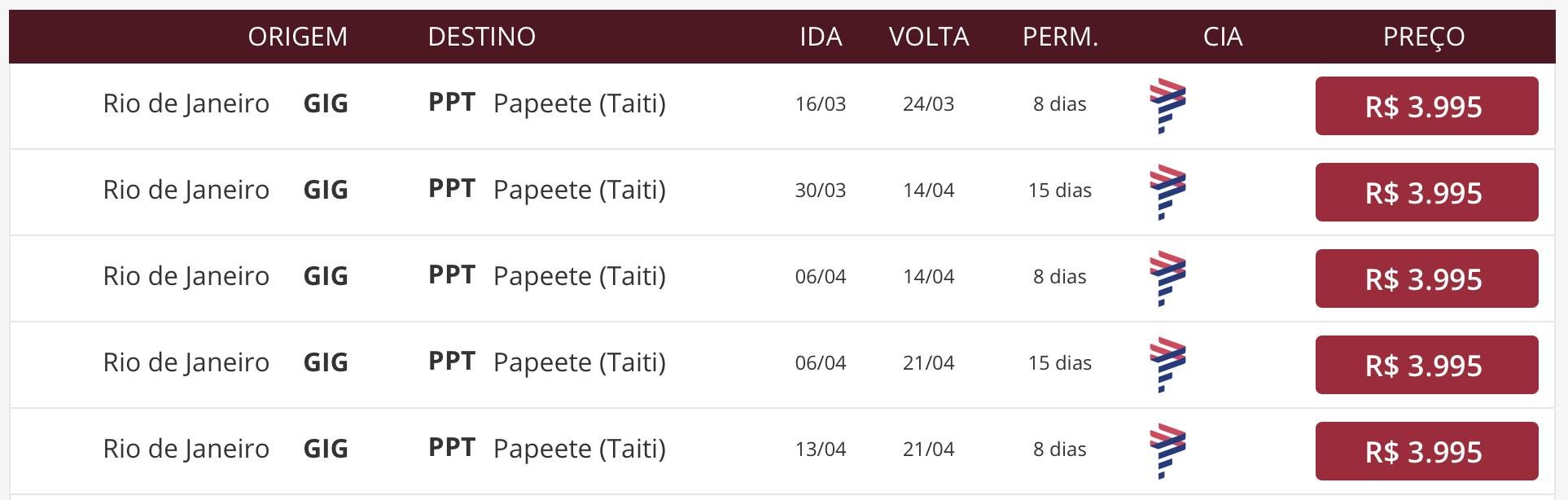 A LATAM tem boas tarifas para o Taiti! Encontramos passagens para Papeete a partir de R$3.995 ida e volta em econômica saindo de São Paulo e Rio de Janeiro.