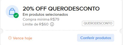 - 20% off, chegando até R$ 60 de desconto, em compras a partir de R$ 79, com o cupom ‘QUERODESCONTO’ [sem aspas];