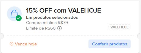- 15% off, chegando até R$ 60 de desconto, em compras a partir de R$ 79, com o cupom ‘VALEHOJE’ [sem aspas];