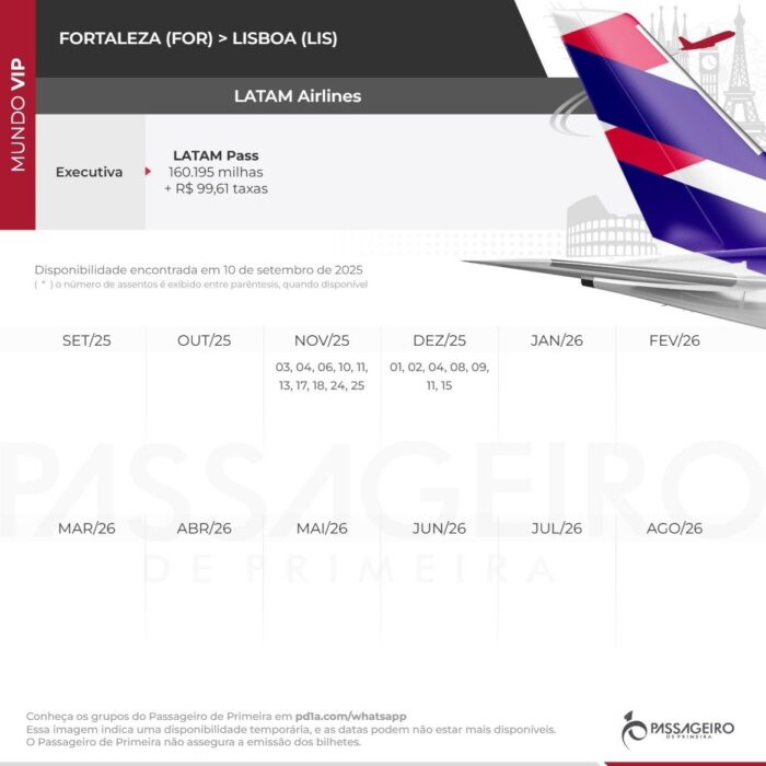 Os Grupos de Alerta do PP funcionam por meio de grupos fechados do WhatsApp, o que garante que você receba apenas notificações relevantes. Cada alerta inclui um calendário intuitivo que resume de forma clara e objetiva as datas disponíveis para a emissão de bilhetes no próximo ano. Apenas uma olhada é suficiente para você saber quando e como aproveitar suas milhas ao máximo. Você encontra em cada um deles: