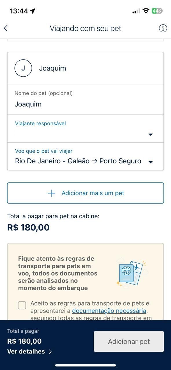 Veja abaixo o exemplo de contratação do serviço Pet na Cabine com o preço promocional de R$ 180 realizada no aplicativo da Azul: