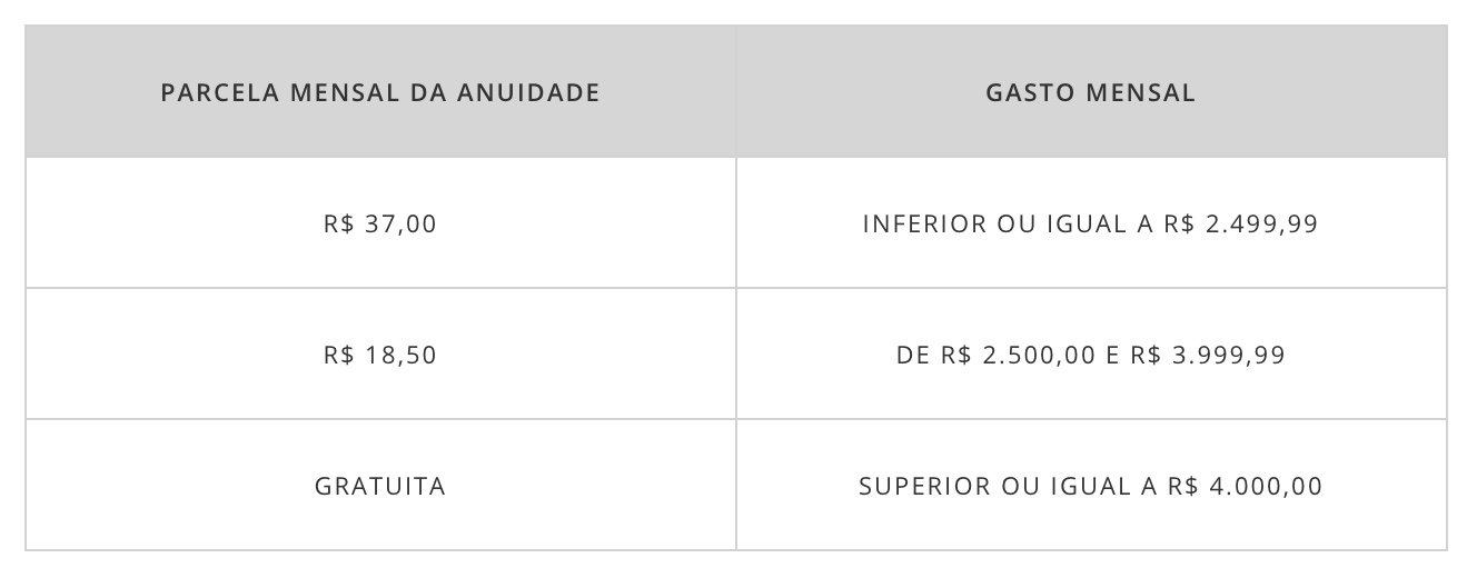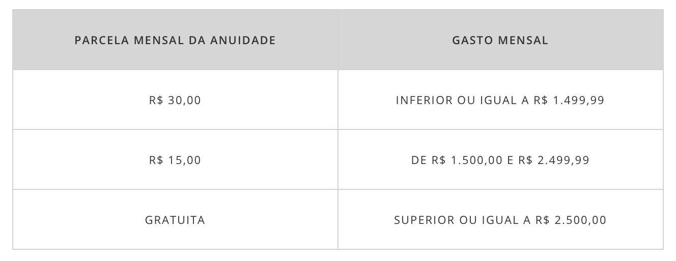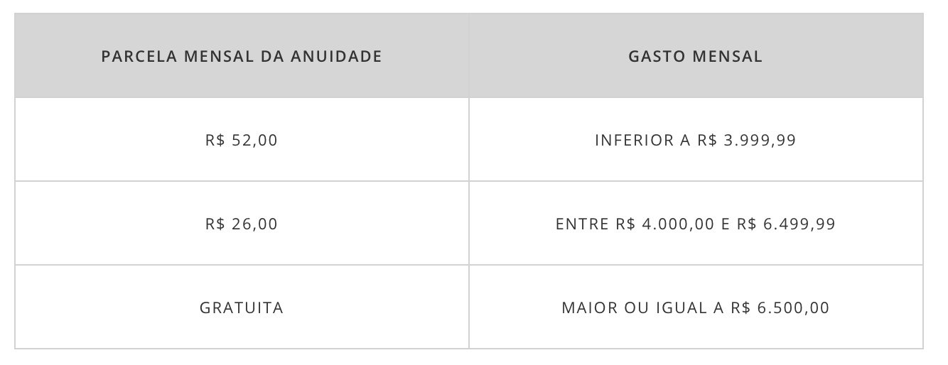 Quando a nova medida entrar em vigor, o valor que você precisará gastar para obter até 100% de isenção dependerá da modalidade do seu cartão, conforme abaixo: