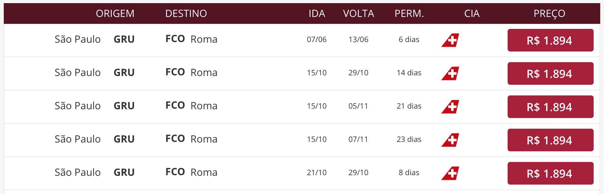 Encontramos passagens a partir de R$1.894 para Roma saindo de São Paulo. Os voos são operados com a SWISS: