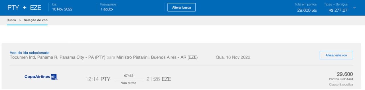 Estamos buscando outras oportunidades durante o dia de hoje. Por hora, encontramos outra excelente emissão na Classe Executiva da Copa Airlines entre a Cidade do Panamá (PTY) e Buenos Aires (EZE) por apenas 29.600 pontos: