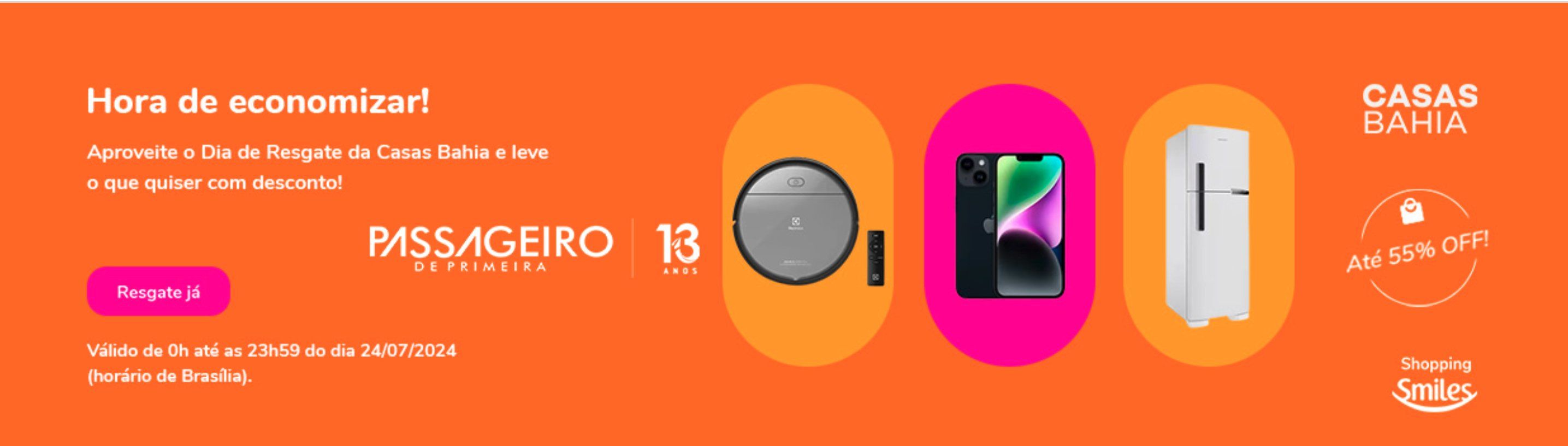 Mais um presentão para você do aniversário do Passageiro de Primeira! 🎉 Hoje você pode resgatar produtos selecionados em toda a loja Casas Bahia no Shopping Smiles com até 55% de desconto. Mas atenção, a super oferta de resgate é válida apenas até as 23h59 de hoje (24). Aproveite!