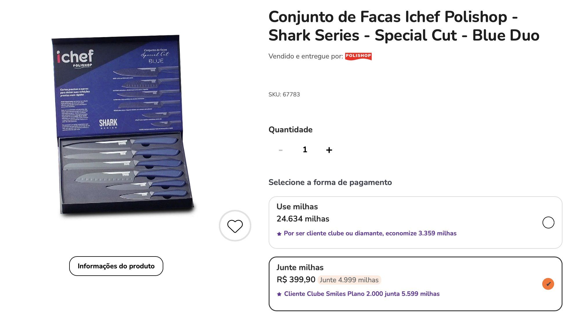 As milhas acumuladas com a compra podem ser vistas ao lado do preço do produto. Veja abaixo um exemplo: